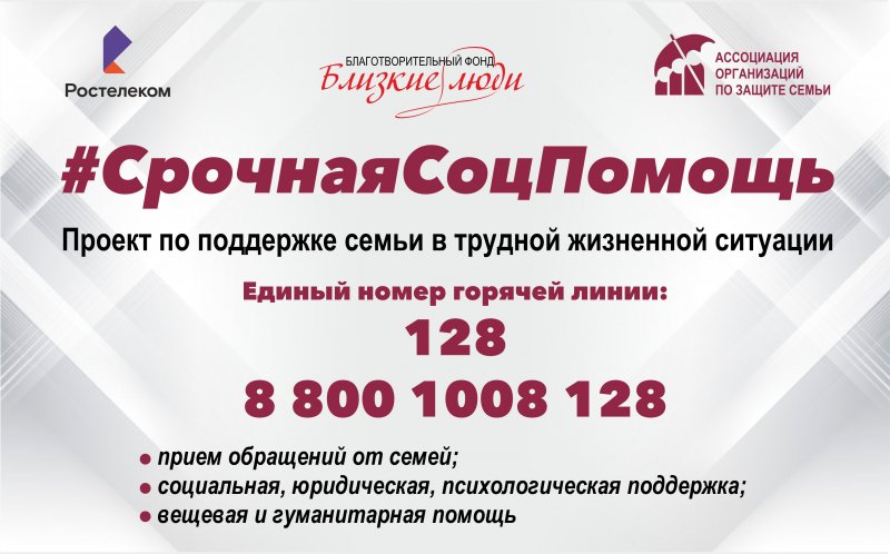 Во Владимирской области запущена работа про-семейного кол-центра с коротким номером 128 с городских номеров и 8800-1008-128 с мобильных телефонов с целью оказания оперативной информационной, психологической, юридической и гуманитарной помощи семьям, попавшим в трудную жизненную ситуацию.